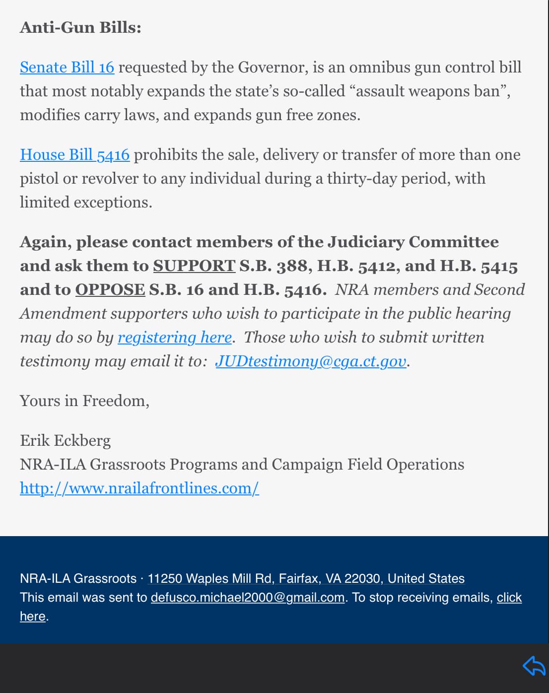 edit, looks like you have some CT stuff on your post…I’ve got the complete shebang…as far as national stuff goes, our input goes to murphy and blumenthal, who are behind all of washingtons gun control bs…ALL of it…so not wasting my time with anything going to them. Tired of their cue-card “common sense” responses.