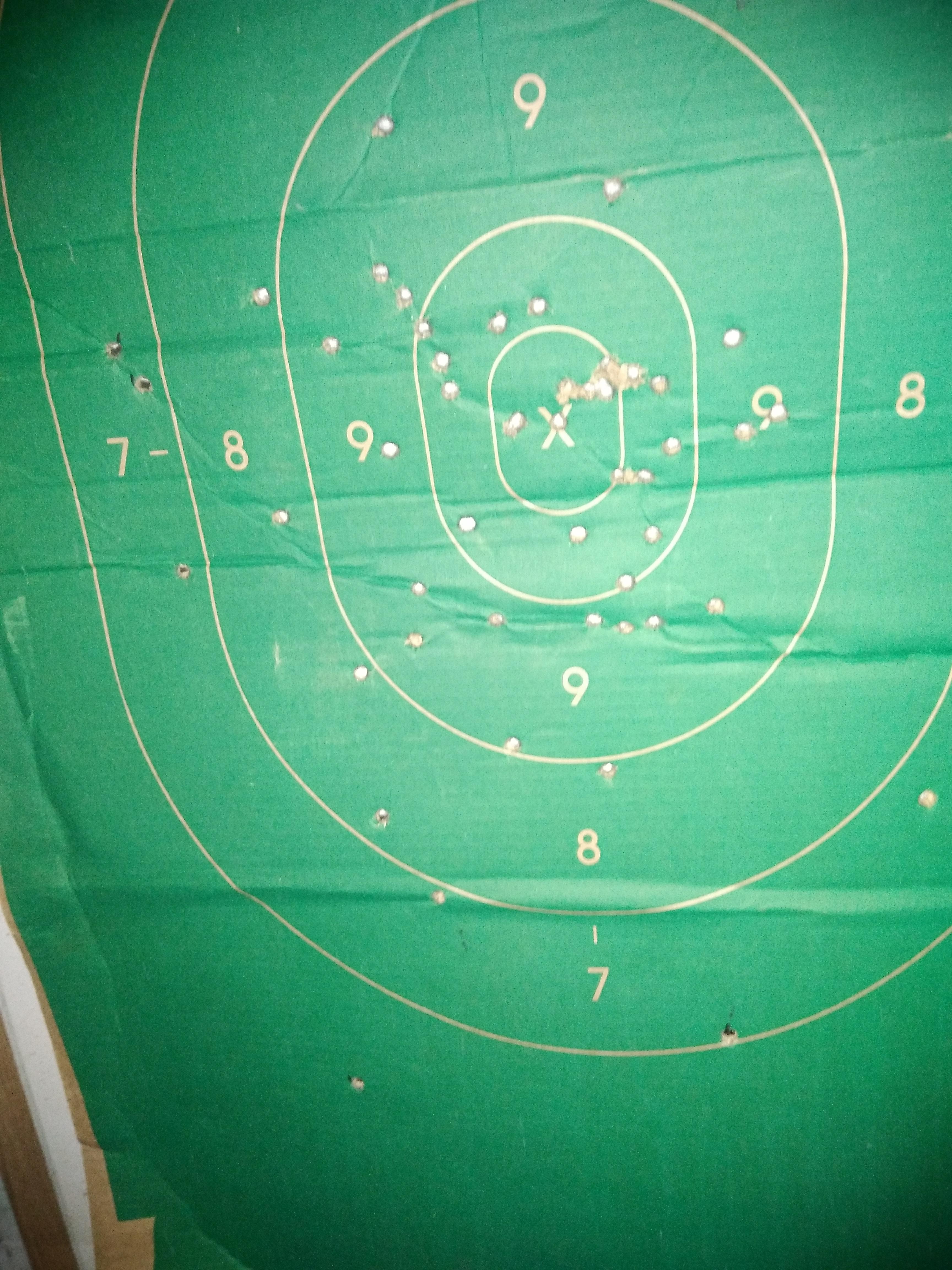 Okay shooting left-handed first major attempt supported only by arm on half cast after surgery on April 19th this year. Using a S&W model 64, 4 inch .38 special, dark marks are powder residue from the revolver shots. Majority of rounds went into 9 ring.