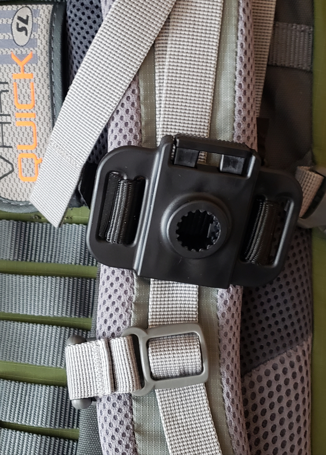 I got mine from Alien Gear, this is the Shapeshifter backpack adapter. It’s got a really clever adjustable connection that lets it work for any thickness strap and has 360 degree cant adjustment. I have a thumb release on it which provides a secure hold, important since I am carrying it in a muzzle-up angle.