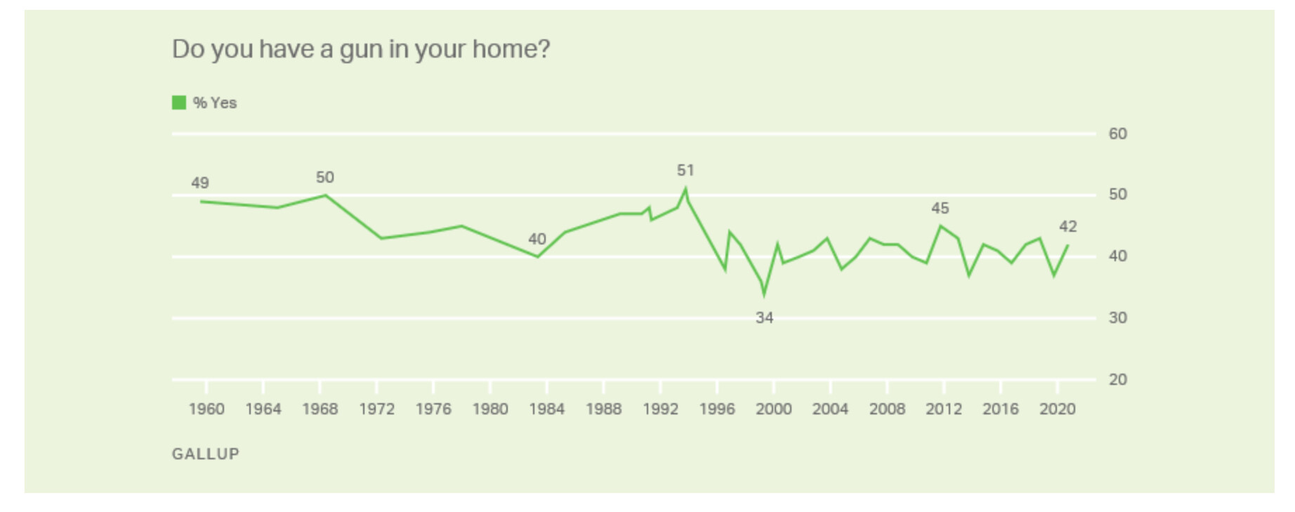 Household gun ownership has declined by 7% through the period, with a notable upward spike around 1994 and a notable downward spike around 1999.