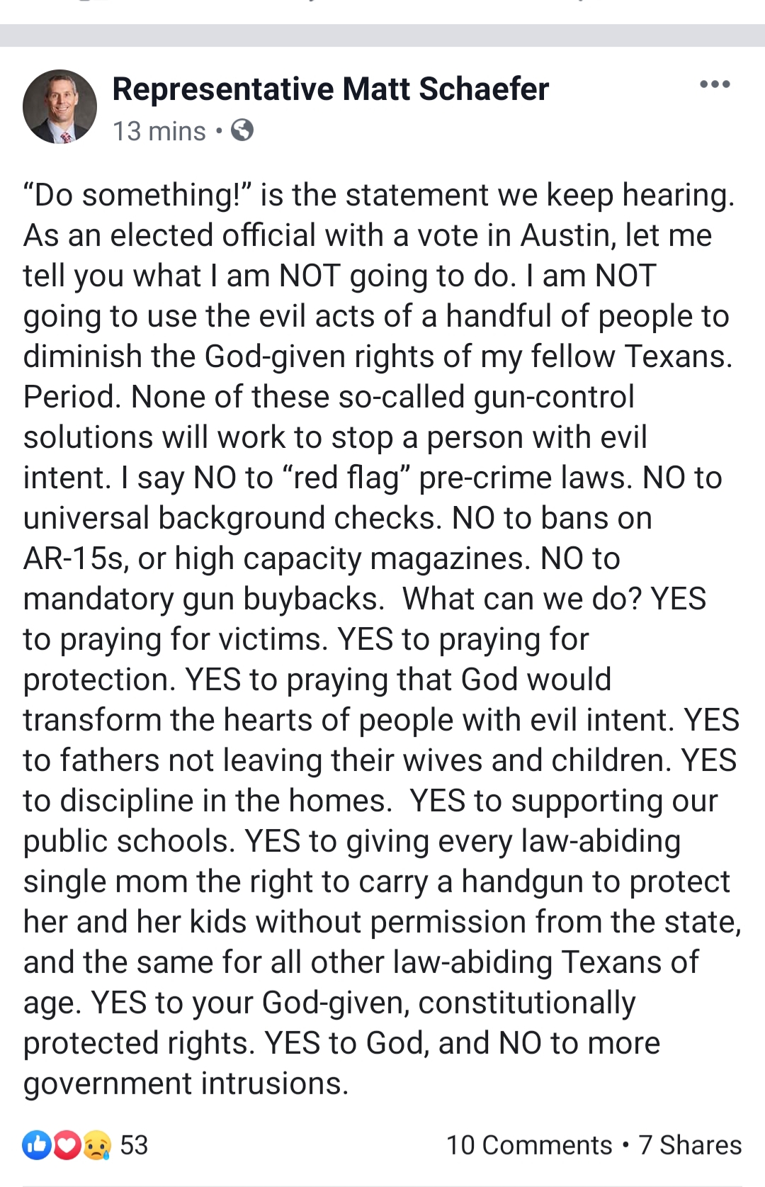 I do not follow Representative Schaefer, however, based on this single post I certainly agree with his Pro-2A stance. Heaven knows we need more objective leadership who understand and protect the 2A.