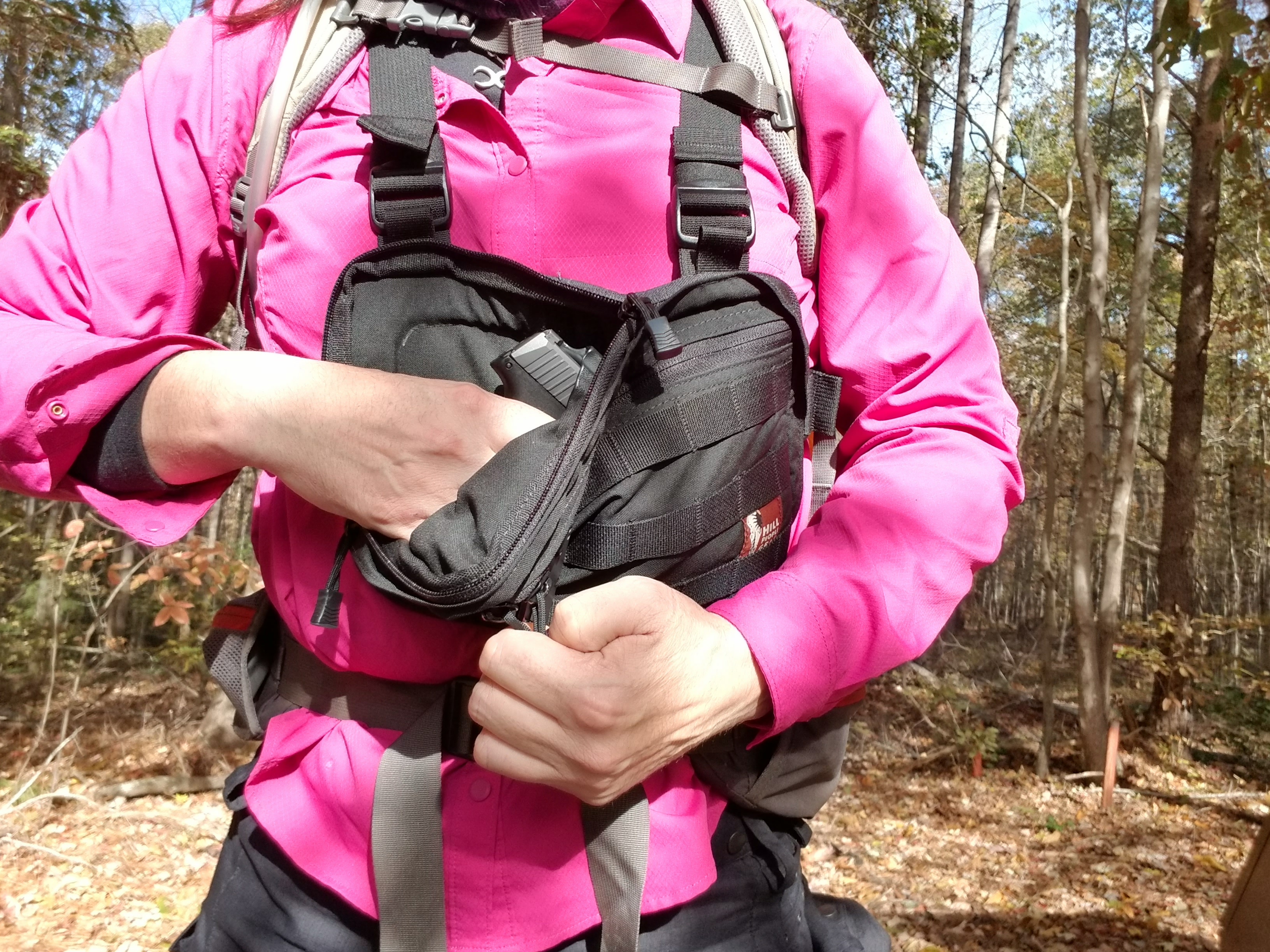 The kit bag harness fits under the pack and the straps but allows you to wear it outside of your clothing and still conceal your firearm. A lot of hikers have started using a chest bag that hooks onto their packs shoulder straps so they can keep essential needed throughout the day easily accessible. Using this kit bag because of that no one will suspect that I am carrying.