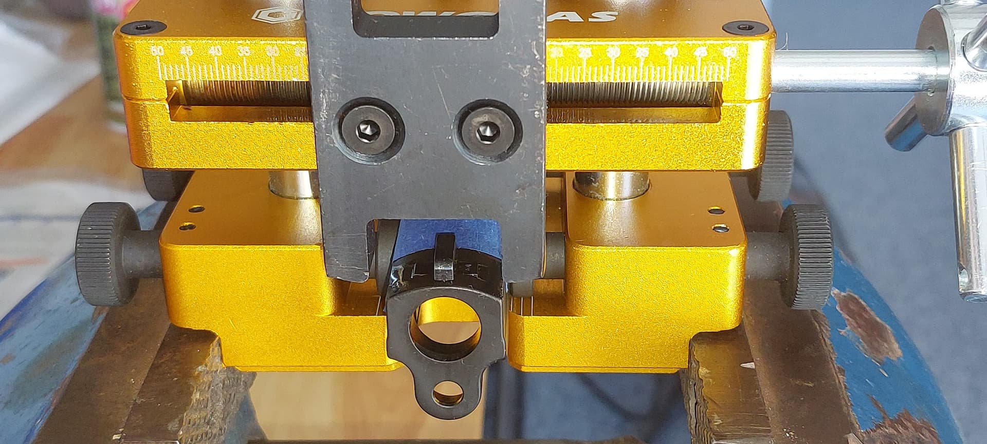 I pushed the old front sight out, cleaned the empty dovetail with alcohol and put a drop of oil in the dovetail slot. I lined the new front sight up and started pushing it in. I was disappointed in how one side of the sight tab was standing proud of the slide. I should have left it alone, but I tapped it with a brass punch. The sight tab broke off! I was then able to press the sight back out of the dovetail by hand.