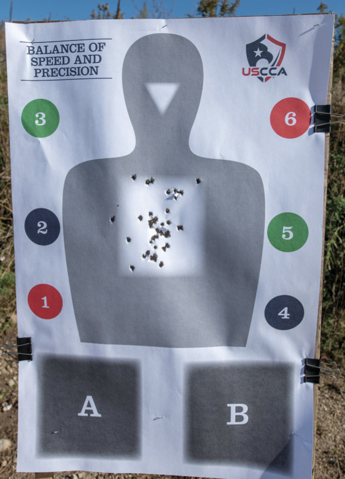 When you’re shooting in a critical dynamic incident, the shots could be as spread out as much as your hand spreads out and still be considered accurate if the placement is right. Anything in the white box on the target below is considered defensively accurate: