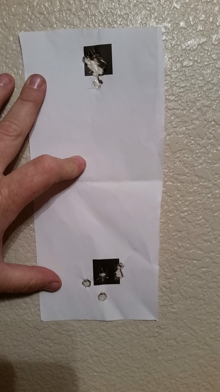 Slow fire trigger control, Ragged Hole drill. 5 shots each on a 1” square at 7 yds. Bottom target was my first attempt. Some dry fire practice after that, then the target on too was my second attempt.