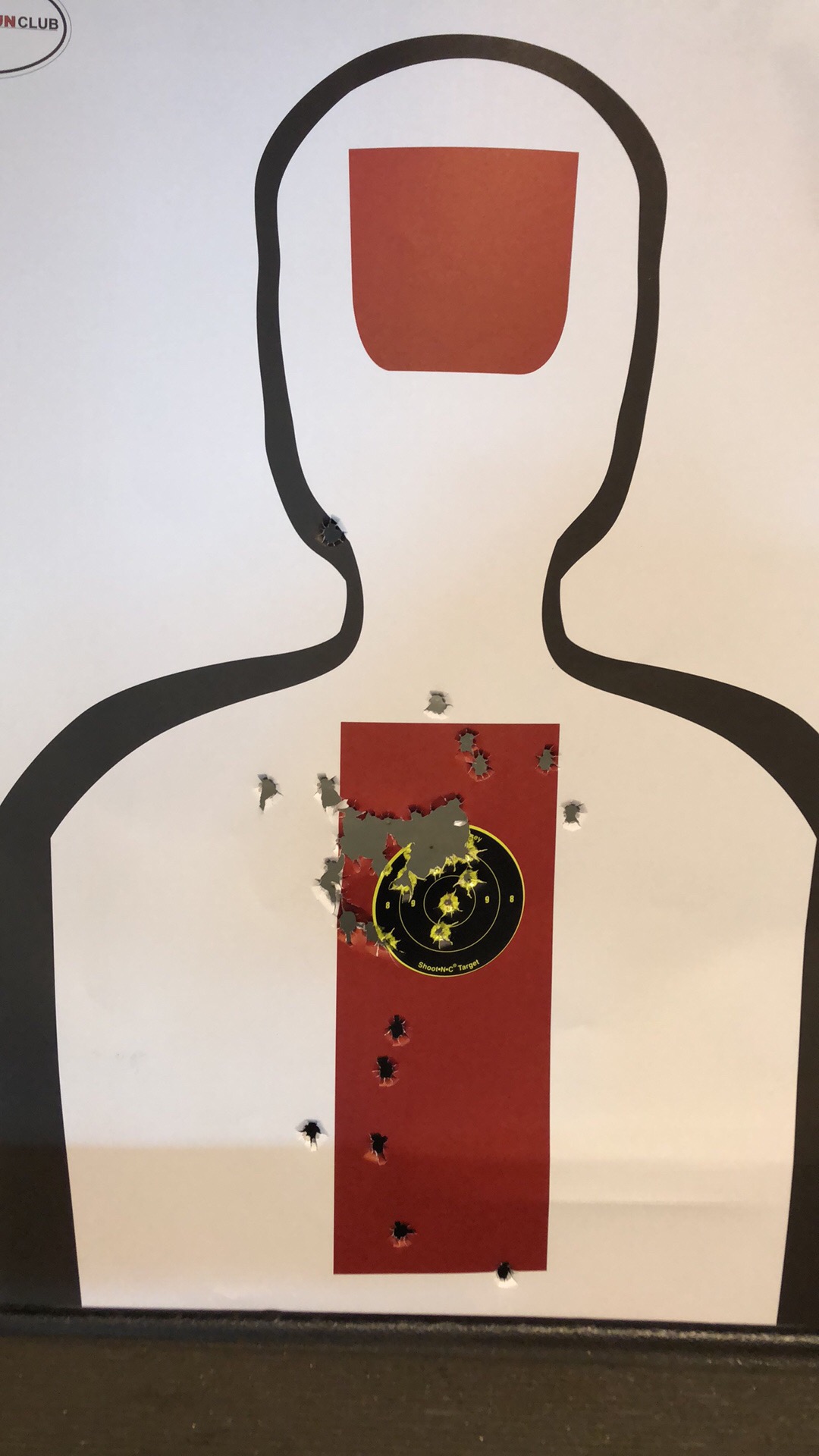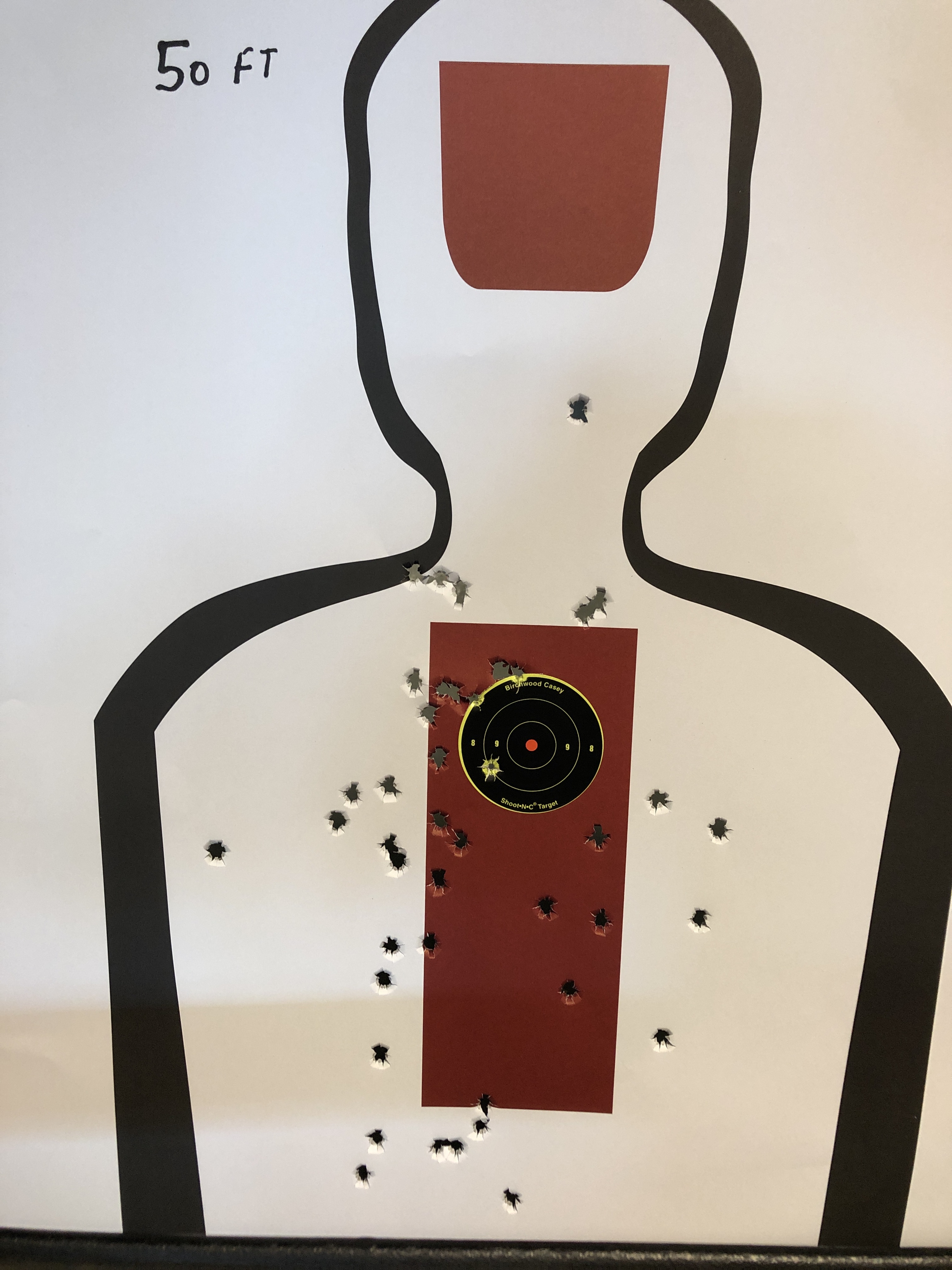 I am posting my targets from my last range time on 8/11/19. I start with a target at 20ft. 1/2 -1 second per round 2 hand. The target with the unintentional headshot was with one hand drill strong hand (Right) alternating with weak hand (Left) same rate of fire. One of the targets is 50 feet same rate of fire. Then back to 20 feet same rate of fire 2 hands. I bought small reactive stickers to bring my aim to a tighter focus.