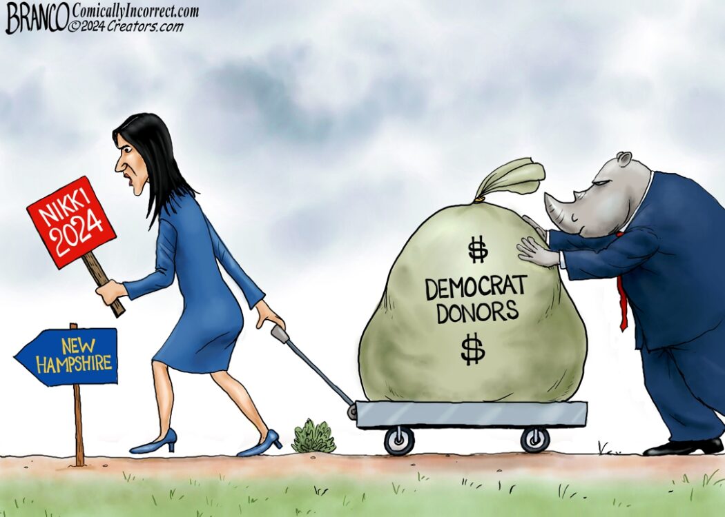 A.F. Branco Cartoon – Nikki Haley is on her way to New Hampshire backed by Democrat donor money and pushed by RINOs in a desperate attempt to stop Trump.