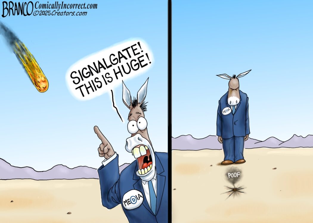 A.F. Branco Cartoon—Signalgate is an issue that the legacy media tried to blow up into a major Trump failure, but it is now turning out to be a huge dud. Hoax journalist Jeffery Goldberg of The Atlantic was accidentally put on a Signal Chat that never discussed classified information, but he tried to present it as such, giving the media something to deflect Americans away from Trump’s accomplishments.
