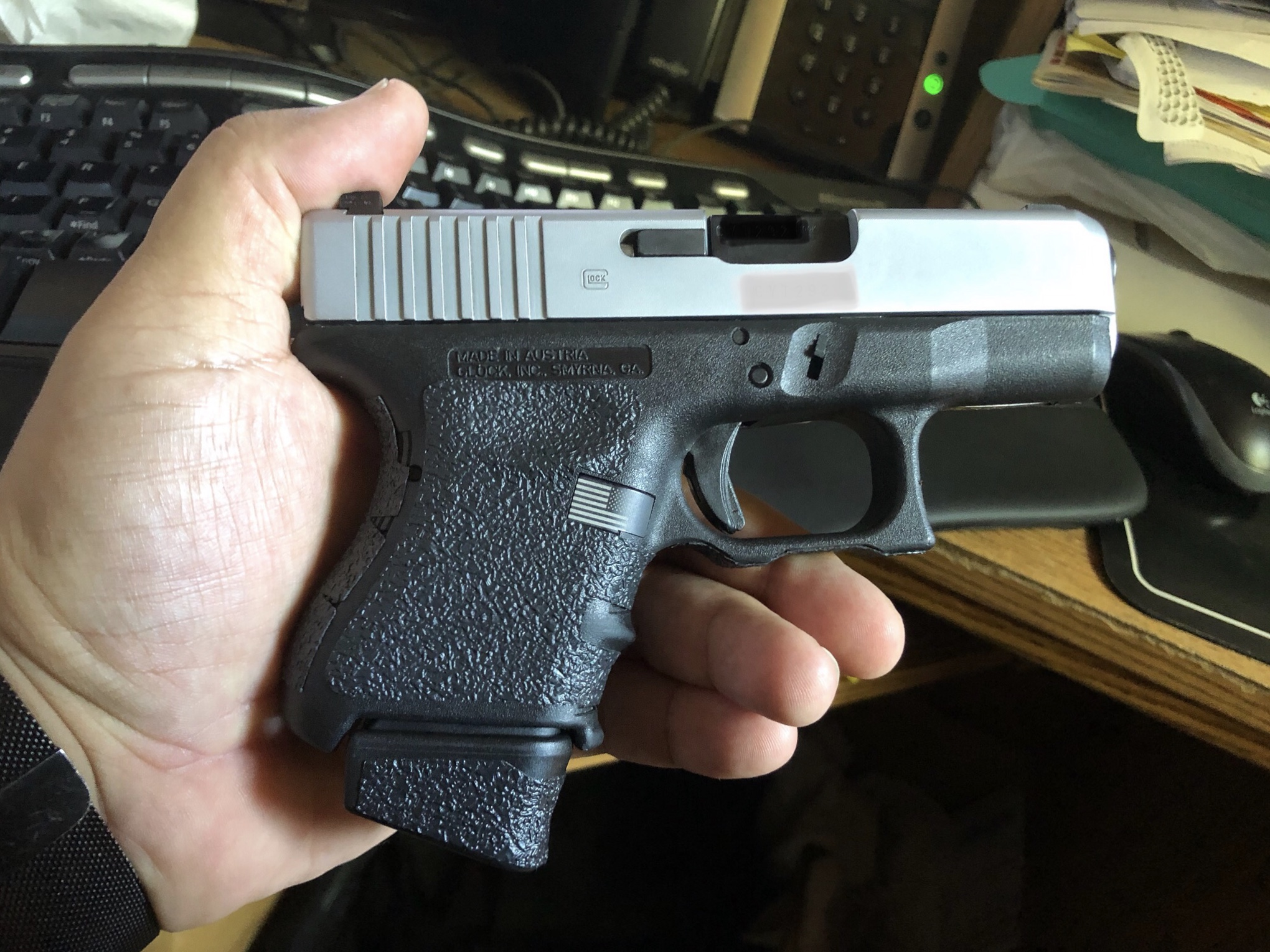 Conceals/carries great, fits inside my same holster as G19/G23, has Glock factory metal night sights. These double stack 10rd plus 0 extended mags work great, you can also get these as +2 rd extensions. I have 4 of them with a 5th that has is a Glock factory mag with finger extension like a pierce style grip which is actually a bit shorter. I have it but don’t really like it or use it. I like using G19 mags as well, but these extended +0 mags still give me the added smidgeon of grip while having a better contour to conceal better.