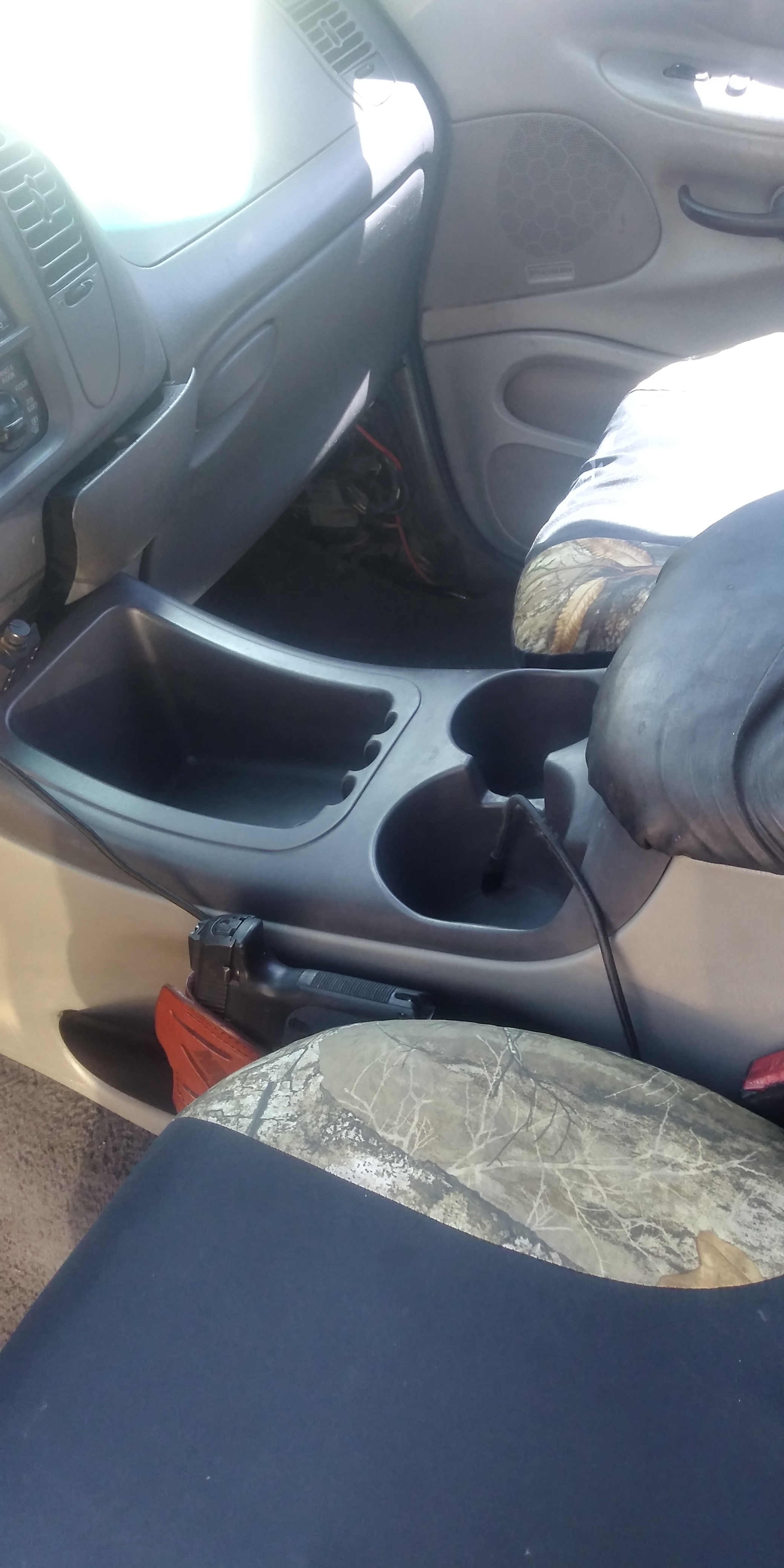 So…ive always wanted a place to put my weapon that was easier to access then the center console or glove compartment, and long trips with it concealed on my side gets uncomfortable at times. While very liw tech…i came up with this, what do you think???