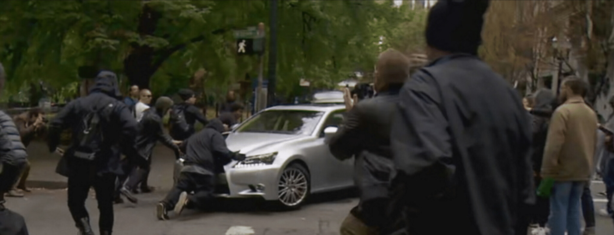 From my article “Trapped in your Car by Protesters”, if I felt my lawyer could articulate that the mob had the ability, opportunity, and intent to cause me death or great bodily harm, I would simply press on the gas.