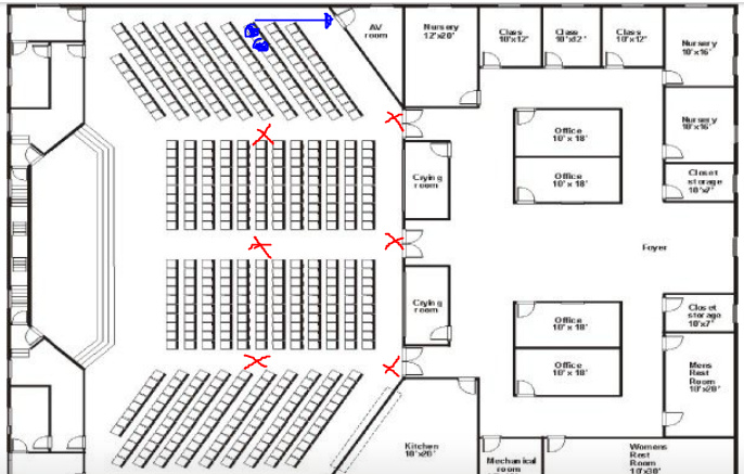 Me and Family in blue with escape route, red X’s would be threat encounter points assuming scenario #1 they’re coming from the lobby (rear door engagement/encounter) and/or scenario #2 the threat was sitting in the audience (assuming they would sit middle/front in order to quickly get to stage area).